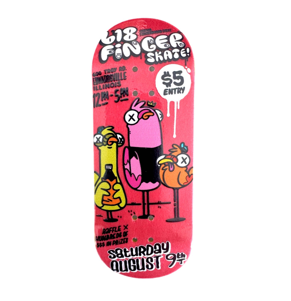 Limited Edition Flyer graphic deck. Replicationg the flyer from this years Chems fingerboard event, This deck is for the Chems fans and collectors out there.Once these are sold out they will not be available again. Graphics are screen printed on deck Available 34mm x 96mm Mid pro, popsicle (shape See Shape guide) High quality 5 ply maple deck. Includes 2 sheets of Black Cat Foam Tape and awesome stickers.